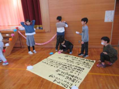 明日の集会に向けて、4、5年生で仕事を分担しながら、体育館を賑やかに飾り付けしました。