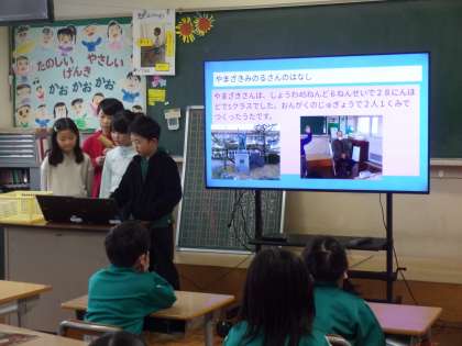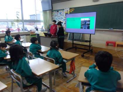 3年生は総合的な学習の時間に、学校のシンボルであるモニューマン像について学んできました。今日は、これまで調べてきたことを、1年生に向けて発表しました。資料を読んだり、地域の方にインタビューをしたりして知ったことを分かりやすく伝えました。下学年の友達が楽しめるように、三択クイズを取り入れるなど、工夫をしながら発表しました。