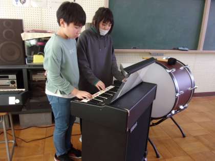 3月11日(月)4年生 ♪合奏練習 公開日 2024/03/12 更新日 2024/03/12 4年生 「茶色の小びん」の合奏に向けて練習をしています。同じパートの友達と音やリズムを確認したり、マレットの種類や楽器の鳴らし方を考えたりしながら演奏しました。