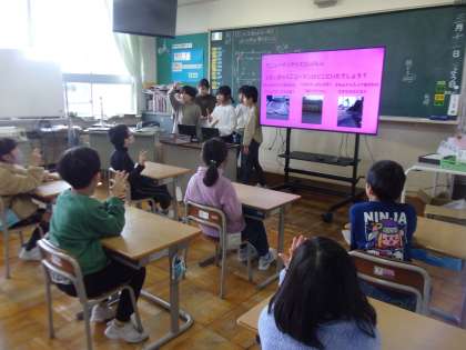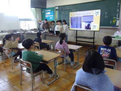 総合的な学習の時間に、学校のシンボルであるモニューマンに像について学んできました。今日は、調べたことを2年生に発表しました。風化した像が地域の方々の協力によって建て替えられたことや、歌が卒業生によって作られたことなど、スライドで分かりやすく伝えることができました。