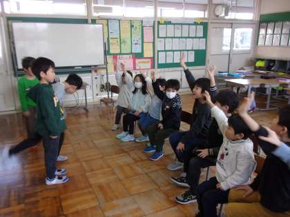 今日の学級集会は、「おもしろいことばかりをする集会にしよう」という担当者の思いから、その名も「おもしろい集会」でした。一発ギャグに笑い、ジェスチャーに笑い、おもしろい絵を描くのに真剣になる子供たちでした。終始盛り上がり、全員の明るい笑顔がはじけました。来週の「スポーツ集会」と「2年生がんばろう集会」も楽しみです。