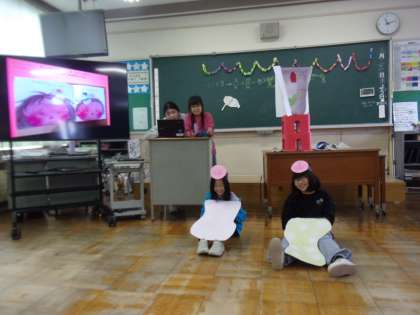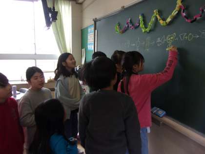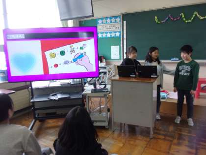 3月21日(木)3年生 「お楽しみ集会」その1 公開日 2024/03/21 更新日 2024/03/21 3年生 3年生最後の「お楽しみ集会」を行いました。お楽しみ係がスライドで説明をした後、絵しりとりや花いちもんめをして楽しみました。また、劇係は、雪だるまのお話の劇を行いました。手作りの小道具を使って、友達と協力しながら演技をしました。