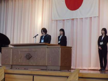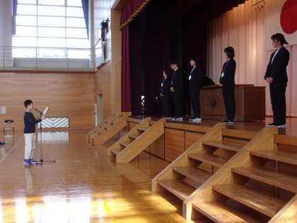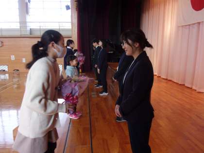 本日、離任式を行いました。離任される教職員の方々へ、代表の子供が感謝の言葉を述べ、花束を渡しました。最後は全校で心を込めて合唱し、感謝の気持ちを伝えました。