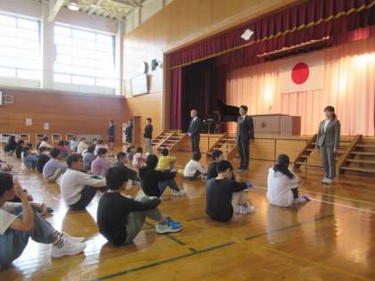 始業式の様子です。校長先生のお話の中に、「みんなのよいところを伸ばそう」「元気でがんばろう」「みんなで前に向いて進んでいこう」などの言葉がありました。昨年度も大きな成長が見られましたが、今年度も子供たちの成長が楽しみです。また、子供たちにとって、一番関心の高い担任発表の瞬間は、期待がつまった独特の雰囲気があります。担任と子供たちが、ともに笑顔で「よろしくお願いします」と言っている姿が印象的でした。