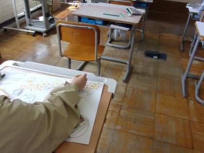 図工の時間に「自分にとっての銀河を描こう」をテーマに一人一人が想像を膨らませながら、マジックやクレヨンを用いて絵を描いていました。クラス全体が集中して取り組んでいました。