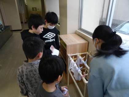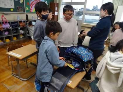 6年生が1年生の朝の準備を手伝っています。ランドセルの片付け方やぞうきんのかけ方を一緒に練習しました。1年生が困っていることを見付けて、自分にできることを考えながら声かけをしています。