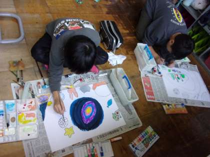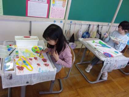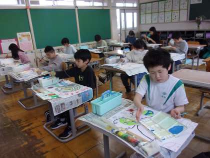 国語の教科書の最初のページは「銀河」の詩でした。「『牛乳をこぼしたよう』と書いてあるけれど、私には蛍が集まっているように見える」「僕は砂粒が降っているように見えるよ」と想像し合いました。「銀河」について調べ、分かったことをノートにまとめました。そして今日は、「自分がイメージする銀河」をクレヨンや水彩で伸び伸びと描きました。「宇宙船から見た銀河」「輝くホタル銀河」「銀河にある島」等、個性的な14枚の「銀河」が集まりました。子供たちの想像力豊かな表現がとても素敵です。
