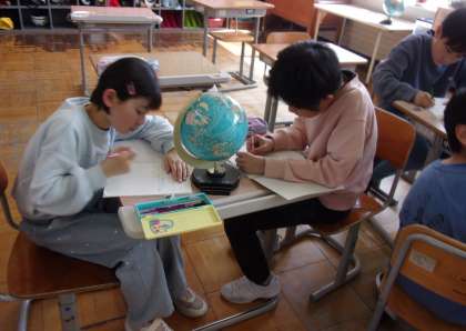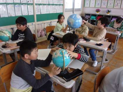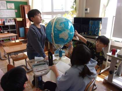 私達の国土を考える社会科の学習で、地球儀を眺めながら気付いたことをノートに書きました。「大陸よりも海が断然広いよ」「日本は小さい」「赤道と日付変更線がある」「国の下に時刻が書いてある」「地球儀に書かれた比率は何だろう」など、たくさんの発見や疑問が生まれました。これからの学習が楽しみです。