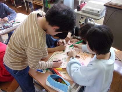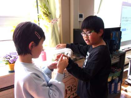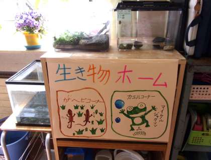 5年教室の「生き物ホーム」には、メダカとカエルとカナヘビがいます。子供たちが、環境をつくり、えさをやり、名前もつけて、大切に飼っています。カナヘビが逃げだしたときには大騒ぎになりましたが、見付けて大喜びし、また環境を変えました。いつも観察したり触れ合ったりして、みんなでかわいがっています。