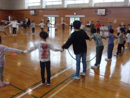 今日の朝日っ子タイムに「1年生ようこそ集会」を行いました。色団の全員が一つの輪になって、手をつないだままフラフープをつないだり、「だるまさんの1日」をしたりなど、みんなの心が一つになるような楽しい時間となりました。