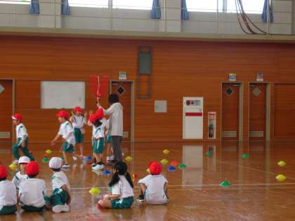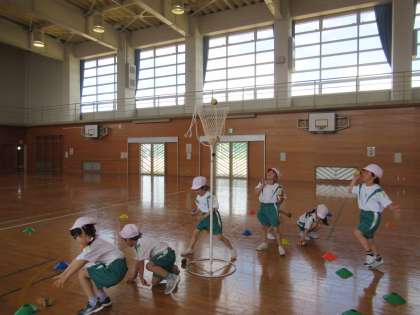 体育科の時間に、玉入れの練習をしました。子供たちはルールをしっかりと確認し、かごに向かって一生懸命に球を投げていました。