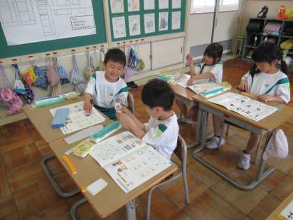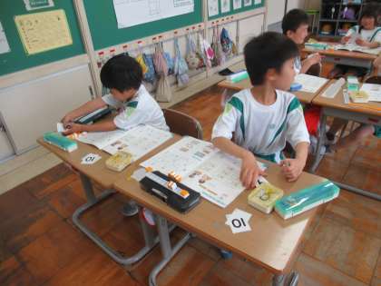 1年生の算数科の学習の様子です。今日は、いくつといくつで9になるかを確かめました。友達と問題を出し合いながら、楽しく取り組みました。