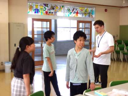 外国語で自己紹介をしています。英語を使って、好きな教科やスポーツを聞かれて答える会話が得意になりました。自己紹介カードを書くことも楽しみ、次回はカードを持って交流できそうです。