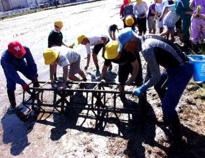 昨日の雨もあがり、さわやかな朝になりました。地域の方にご指導いただき、田植え体験をしました。「ころがし」で印をつけたところに、苗を3本ずつ植えていきます。3本の指で土に埋まるようにしっかりと植えることを覚え、やっていくうちに慣れていきました。その後、教室で「最初は難しかったけど、楽しくなってきて、ペースアップした」「足がとられて大変だったけど、歩き方のこつを教えてもらったら歩きやすくなった」と、自分なりの成果を交流し合いました。機械の効率のよさを感じながらも、手植えのこつや方法、よさ等、今まで調べたことを伝え合いながら、体験と重ねて学習を深めました。