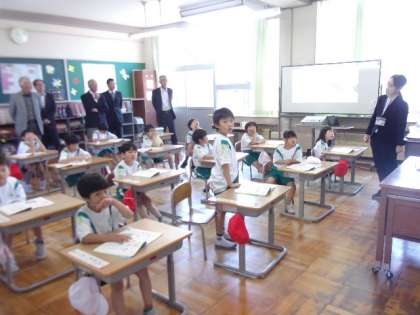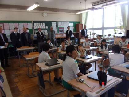 まず始めに、学校の子供たちの様子を参観していただきました。子供たちも地域に住んでおられる委員の方々をよく知っているので、とても嬉しそうでした。そして、落ち着いて学習していることをほめていただきました。