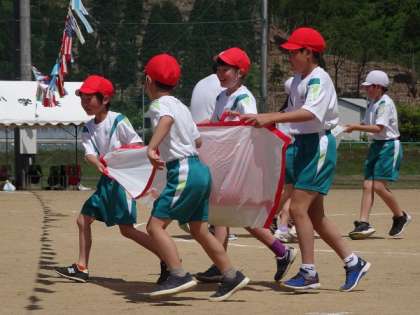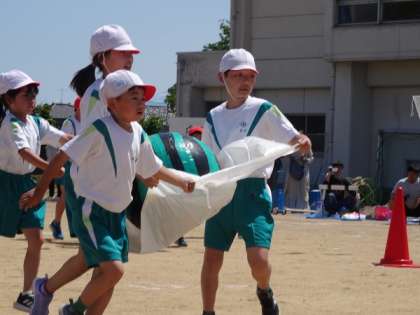 全体競技では、大きな朝日スイカに見立てたボールをなかよし班で協力して運びました。シートの持ち方や運び方をそれぞれで相談しながら、工夫して取り組みました。