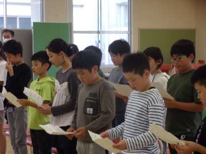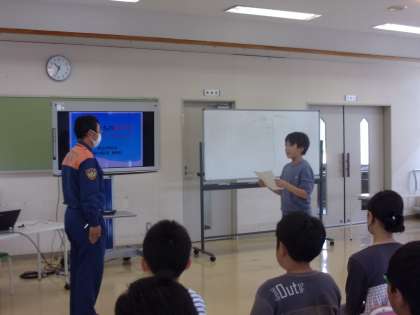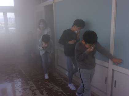 本日、婦中消防署の方より、BFCバッジを授与していただき、5年生全員で誓いの言葉を述べました。防火教室では、クラブ員としての活動のこと、火災・地震の発生の恐怖や防災のためにできること等、専門家の立場から貴重なお話を伺いました。その後、実際に煙で視界が悪い中を、身を低く、壁をつたいながら、最小限の呼吸で歩くことを体験し、火災現場の怖さや救命活動の大変さを実感することができました。今後は、避難訓練の意味を考え、より真剣に行うという意識も高めました。