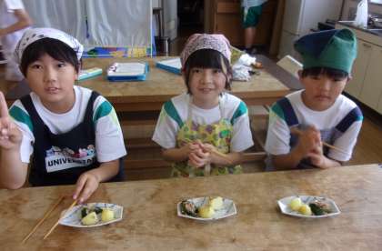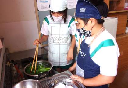 ほうれん草は、みるみる色や堅さやかさが変わっていくので、芯がしんなりするのを見逃さないようにと、鍋に張り付いて見守りました。皿を出したり片付けたりする子供、切って盛りつける子供、それぞれに分担して手際よく行う様子に感心しました。好みの味付けで食べながら、「ほうれん草はやわらかくて美味しい」「じゃがいもはちょうどよくゆでるのが難しいね」と感想を言い合いました。