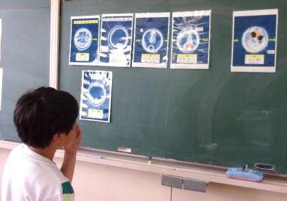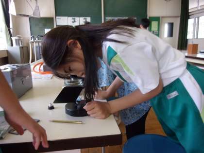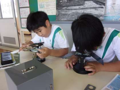「生命のたんじょう」の学習で、メダカの卵を取り出して、解剖顕微鏡で観察しています。真剣にレンズを覗き込み、その卵が無精卵か有精卵を見極めています。無精卵が多い中で「有精卵だ」と一人が発すると、みんなで順に見合い、確かめました。そして、黒板に貼られた卵の写真と見比べながら「孵化して一日目から二日目かな」と考えました。