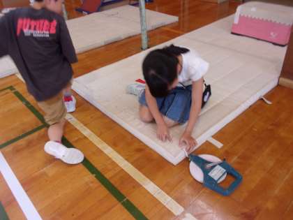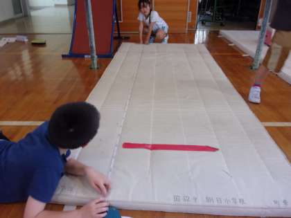 今日は「巻き尺で正しく測ろう」という目当てをもち、ペアになってマットの長さを測りました。巻き尺をまっすぐにして測ることや、1目盛りの大きさに気を付けて読み取ることに苦戦しながらも、正しい長さを測ることができました。