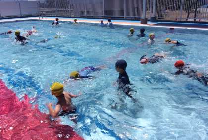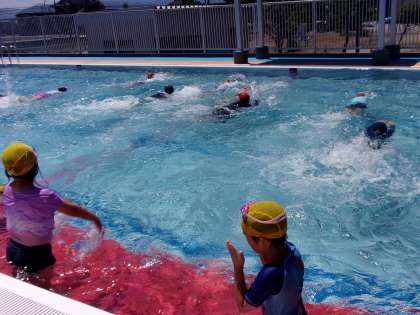 プール開き後に、2年生と5年生で1対1のバデイをつくり、一緒に水の中に入りました。歩いて大きく回りながら水に体を慣らし、その後、一人で泳げる子供は一人で泳ぎ、少し怖がる子には5年生が手を添えて、バタ足で進みました。5年生が泳ぐときには、2年生が「がんばれ」と声援を送るなど、互いの励ましを喜びながら、仲良く水泳学習をすることができました。