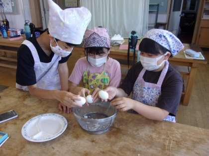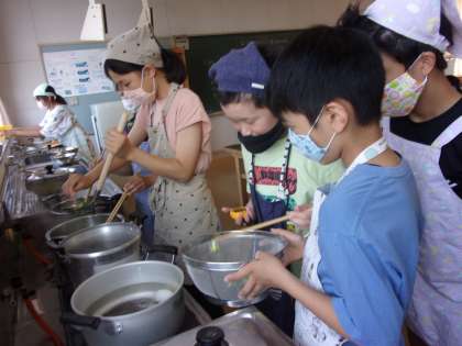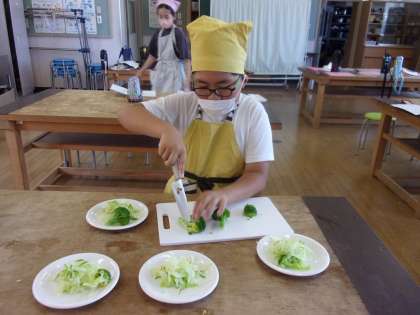「ゆでるポイントを確かめながら、オリジナルのサラダをつくろう」の課題で、班ごとに自分たちで考えたサラダに挑戦しました。「卵は沸騰して8分ではまだ柔らくて、皮がむけないね」「水でしっかり冷まさないからだよ」「キャベツは生でも食べれるからゆですぎなくていいよ」「トウモロコシは小さく切った方が早いよ」と考え合いながら、協力して取り組みました。前回の経験を生かし、同時に分担して進めるなど、手際よく丁寧に調理をする子供たちでした。