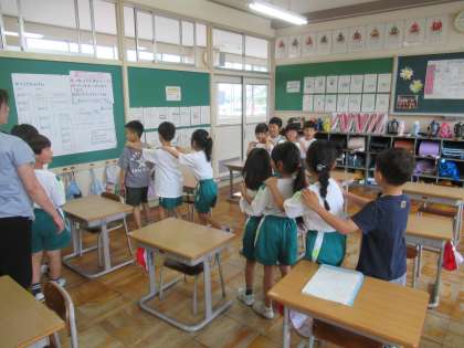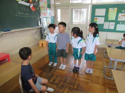 今日から、1年生に新しい仲間が加わることになり、1時間目に「ようこそパーティー」をしました。自己紹介をしたり、貨物列車をしたりして、なかよく過ごしました。また、校内を歩き回り、案内をしました。