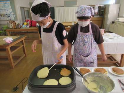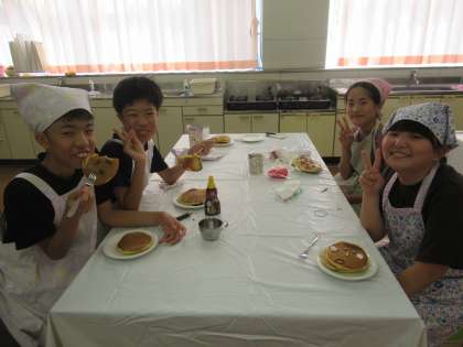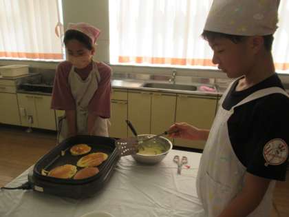 簡単クッキングクラブでは、ホットケーキ作りを行いました。友達と協力しながら、材料を混ぜたり、ホットプレートで焼いたりしました。焼き上がった後は、ホイップクリームやチョコソースで盛りつけをしました。