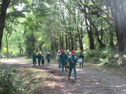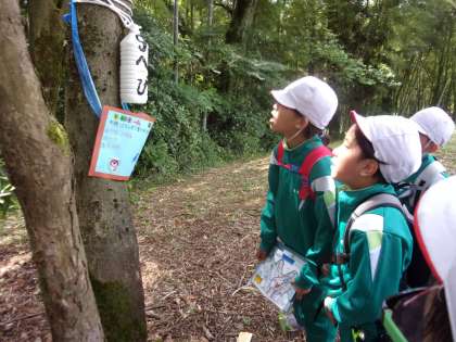 オリエンテーリングです。地図を見ながら各班で考えた木のクイズや遊びのポイントを、班で協力して見付けました。