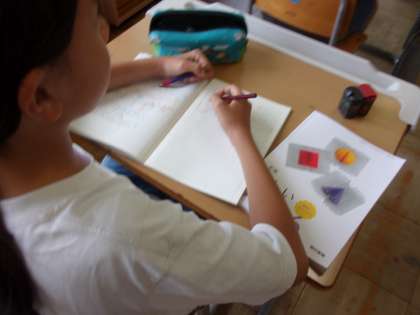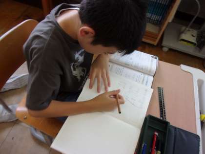 分数のわり算を学習しています。これまでと違った分数の式を見て、約分できることに気付いたり、小数が式に入っているときは分数に直すと計算できることを見付けたりしました。