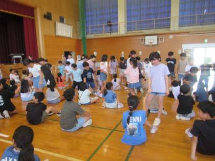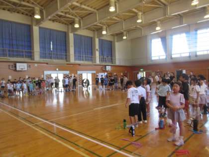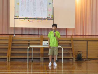 集会の進行担当の人たちが楽しく進めてくれたので、皆仲良く楽しい時間を過ごすことができました。各学年からの発表に続いては、スマイルハッピー委員会による企画「じゃんけんゲーム(朝日の流れ星通れるかなゲーム)」を全校で行いました。最後まで勝ち進んだ人には、図書室のプラスワンチケットが贈られるということで、盛り上がりました。最後は全員で心を込めて「にじ」を歌い、自分や友達が輝く姿をたくさん見つけられたすてきな集会になりました。