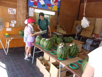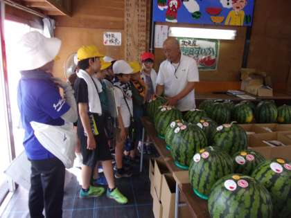 7月18日(木) すいか直売所見学 公開日 2024/07/18 更新日 2024/07/18 4年生 総合的な学習の時間に「朝日すいか」について調べている中、「直売所に行きたい」「お客さんはどこから来ているのかな」という思いをもった4年生。疑問を解決するために、直売所の見学に出かけました。 お客さんに質問したり、お店の様子を観察したり、売られているすいかを調べたりして、とても充実した見学でした。地域の方のご協力のもと、よい学習をすることができました。
