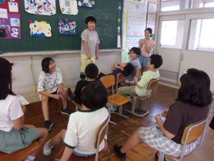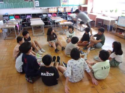 1学期も明日で最後、今日は学級イベントで楽しみました。「ハンカチ落とし」や「伝言ゲーム」「お題しりとり」「何でもバスケット」など、どのゲームも知恵を使い合い、声を掛け合い、笑い合い、全員で盛り上がりました。最後の言葉で、「みんなで楽しめてよかった。2学期も、汚い言葉や態度がない明るいクラスにしよう。」との呼びかけがあり、みんなで賛同しました。仲良しの輪が広がった、すてきなひとときでした。