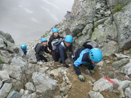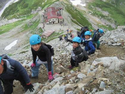 「ここからが本番です」とのガイドさんの声に緊張感を高め、一の越を背に出発しました。最初は、崖の下を見下ろすのを怖がり、岩に手をつきながら慎重に進んでいきました。三の越からは「もうすぐだ、がんばろがんばろ」「笑顔でファイトー」と後ろの子供から大きな声が。そしてつながる掛け声と歌声のパワーで、最後までみんなで雄山を目指すことができました。