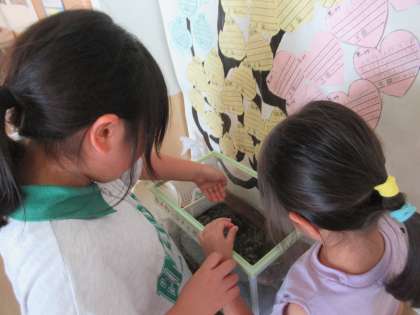 休み時間は、久々に会った友達と元気に遊んでいました。亀と触れ合っている子もいました。