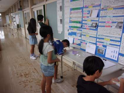 4年生 自由研究 公開日 2024/08/29 更新日 2024/08/29 4年生 友達が夏休み中に取り組んだ研究や工作をじっくり見て、お互いに感想を伝え合いました。 友達の自由研究を見ながら「へえ、おもしろいね」「こんなにたくさん書いたなんてすごいよ」と温かい言葉が飛び交う時間になりました。また、自分の作品を見てもらってうれしそうな子供たちの様子もうかがえました。2学期もあたたかく楽しい学級を目指していきます。