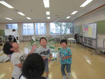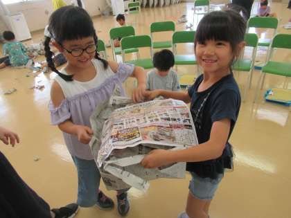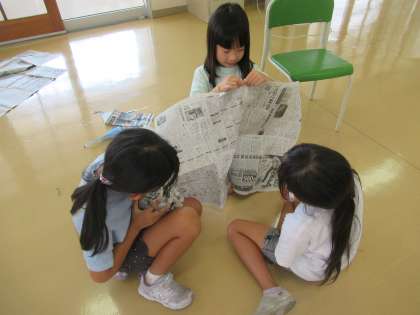 図画工作科の学習の様子です。今日は、新聞紙を使った造形遊びをしました。子供たちは、新聞紙をちぎって細かくして空中にばらまいたり、丸めて人形を作ったりするなど、思い思いに表現を楽しんでいました。