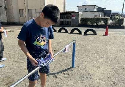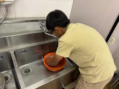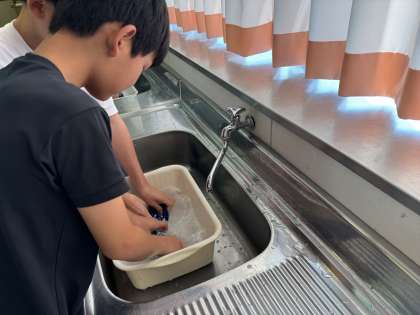 9月4日(水)6年生 家庭科の学習 公開日 2024/09/05 更新日 2024/09/05 6年生 家庭科で衣服の手入れについて学習しています。今日は洗いおけを使って手洗いを実践しました。洗濯機の便利さやありがたみに気付くとともに、もみ洗いで汚れた水や、パリッと仕上がったハンカチに満足気な様子でした。