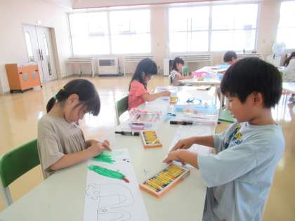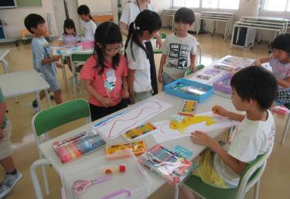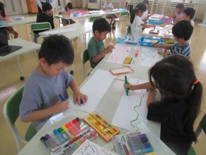 9月11日(水) 1年生 図画工作科の学習の様子 公開日 2024/09/12 更新日 2024/09/12 1年生 図画工作科の学習の様子です。カラーペンで色々な線を書き、そこから思いついたものをクレヨンで表しました。子供たちは、海や空等、様々な物に見立てながら、楽しく描画していました。