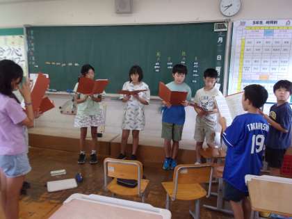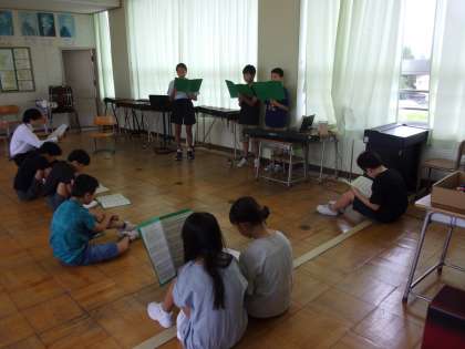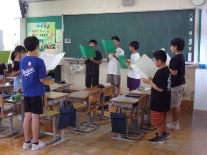 9月11日(水)4・5・6年生 合唱の練習 公開日 2024/09/12 更新日 2024/09/12 5年生 学習発表会に向け、朝日バージョンにアレンジした「ふるさとの空」という曲を練習しています。それぞれのパートごとに集まり、「1番だけ繰り返し歌おう」や「少人数で歌えているかどうか確認しながら歌おう」などと工夫しながら練習しました。