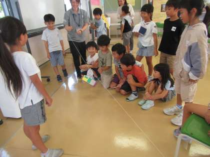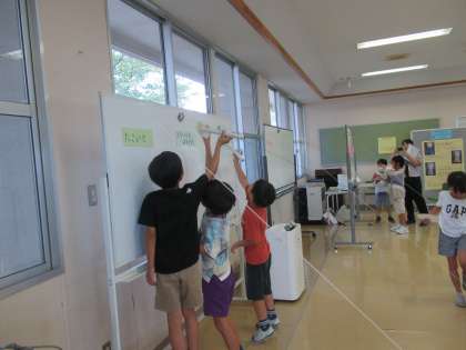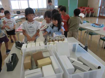 図画工作科「スルスルビューン」の学習の様子です。子供たちは、材料をひもで滑らせながらイメージを膨らませて、自分だけの「スルスルビューン」を作ろうと、一生懸命に取り組んでいました。