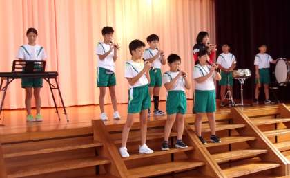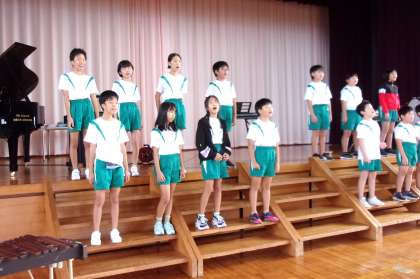 5年生の「祝朝日『よろこびのうた』スペシャルメドレー」。子供たちが思う達成度がぐんぐん上がってきました。練習後に演奏動画を見て、活発に気付きを交流し、翌日の演奏に生かしている成果です。音量バランスを考えた友達に「○○の音はもっとやわらかくしたら」と言われた子は、今日は鳴らし方を意識して演奏し「こんなふうにできた。音が変わったよ」と工夫したことを話します。「○○さんがリズムに乗って揺れて演奏している」と友達のよさを広めるなど、「みんなで楽しく、聴く人も楽しくなるように」が、全員のキーワードです。よりよいものをつくりあげようとする子供たちの熱意が、素敵な音色に表れています。