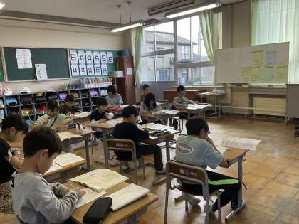 10月11日(金) 3年生 国語科の学習 公開日 2024/10/12 更新日 2024/10/12 3年生 『読む人に必要なことが伝わる手紙を書く』という目標をもち、学習発表会を案内する手紙の書き方を学習しています。今日は手紙の文章の組み立てを理解し、教科書の参考例をもとに下書きを書きました。