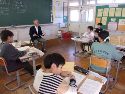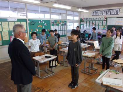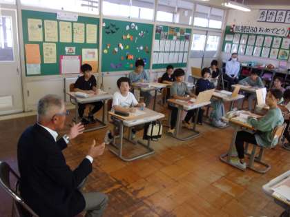 5年生はこれまで、社会科で日本の米作りの学習をし、総合的な学習の時間には、「朝日の米作りのすてき」について考えてきました。今日は、今までも田植えや稲刈りでお世話になった地域の農家の方にお越しいただき、年間を通した朝日の米作りのことについて、沢山の質問をさせていただきました。「田植えの前や稲刈りの後の田の手入れ、水の管理や肥料まきのこと、米の種類や米の行方、組合で農業をしていること等、詳しく教えていただきました。「収穫が何よりの喜び、少しでも多く収穫するために全ての苦労をしている」という言葉に、米作りにかける農家の方の思いの熱さを実感した子供たちでした。今まで以上に朝日の田や米、農業に関心を高め、農家の方への尊敬と感謝の気持ちを大きくしました。貴重な学びの機会をありがとうございました。