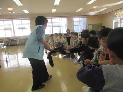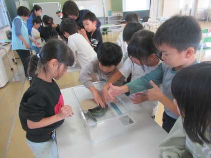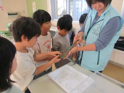 ファミリーパークの職員の方が2名来校され、ホクリクサンショウウオの出前授業を行っていただきました。呉羽丘陵にすみ生き物の紹介や、ホクリクサンショウウオの現状と保全活動についてお話ししていただきました。