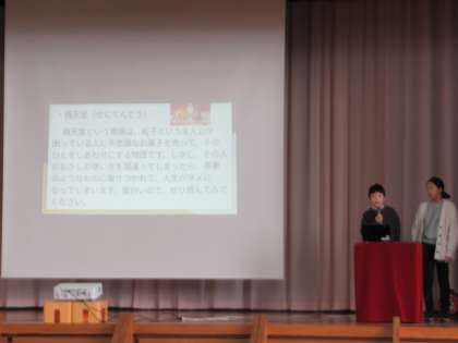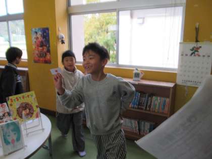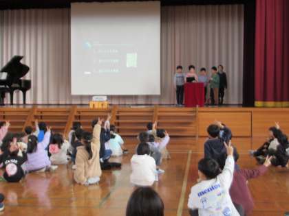 読書集会を行いました。かしこく委員によるクイズやおすすめの本紹介、図書室の新しい本が書かれたカードを見つけるトレジャーハンティングゲームや今月の歌を歌い、盛り上がりました。最後の振り返りでは、「家ではゲームばかりではなく、本を読みたい」「おすすめの本や図書室の新しい本を読んでみたい」と話していました。これからも読書に親しみましょう。