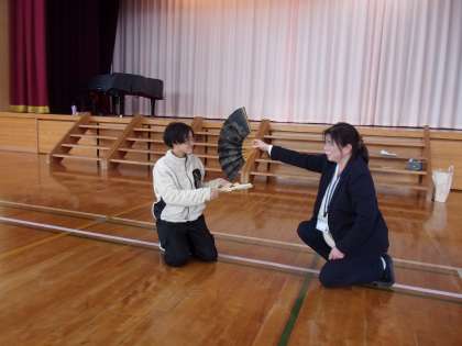 狂言を習っておられる先生に来ていただき、狂言について学びました。狂言と学習発表会で披露した劇との違いを考え、舞台の形や歩き方、話す言葉や抑揚の付け方、小道具の使い方等について教えていただきました。最後には、狂言で使う「おゆるされませ」「やるまいぞ」などと言いながらすり足の歩き方も実際に体験しました。