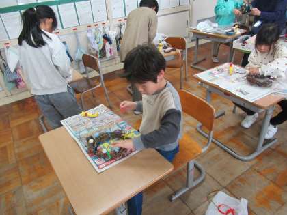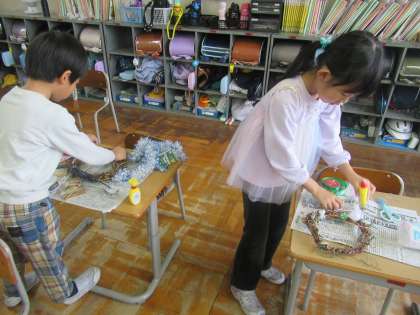 11月27日(水) 1年生 生活科の学習の様子 公開日 2024/11/28 更新日 2024/11/28 1年生 生活科の学習で、アサガオのつるを使ってリースを作りました。今日は、毛糸やモール等の材料を使って飾り付けをしました。子供たちは、色や形を考えながら、リース作りを楽しんでいました。
