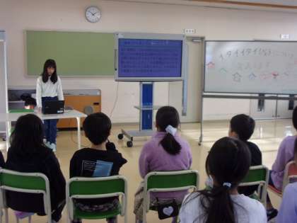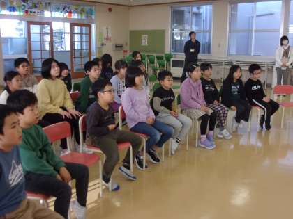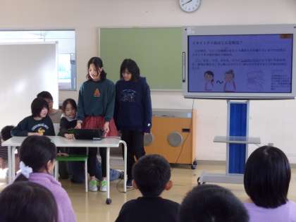 総合的な学習の時間に調べたり資料館で学んだりした「イタイイタイ病」について、3、4年生に発表しました。イタイイタイ病の発生、被害、住民の闘いや今の環境について、患者や住民の声や思いを交えながら、分かりやすく伝えました。発表の後に、3、4年生が初めて知ったことや思ったこと等を言ってくれたので、自分たちが伝えられたことを嬉しく思うとともに、「このような辛い病気や被害が二度と発生しないようにしたい」「暮らしと環境を守るために戦ってきた住民の方に感謝したい」「このようなことを自分たちが忘れずに伝えていきたい」「環境を大切にしたい」という思いを改めて強くしました。