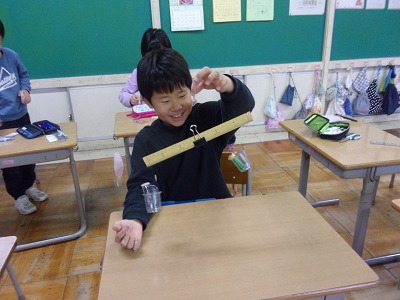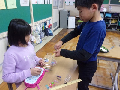 重さの学習が始まり、「重さって、どういうこと?」と尋ねると、子供たちは「体重。〜キロ。」「ものの重さ。」「グラム。」と話し、身近なこととしてよく分かっているようでした。そのような重さについての学習を始めるにあたり、今日は自作の天秤を使って身の回りの持ち物の重さ比べをしました。調べた結果、いちばん重かった物はコンパスでした。